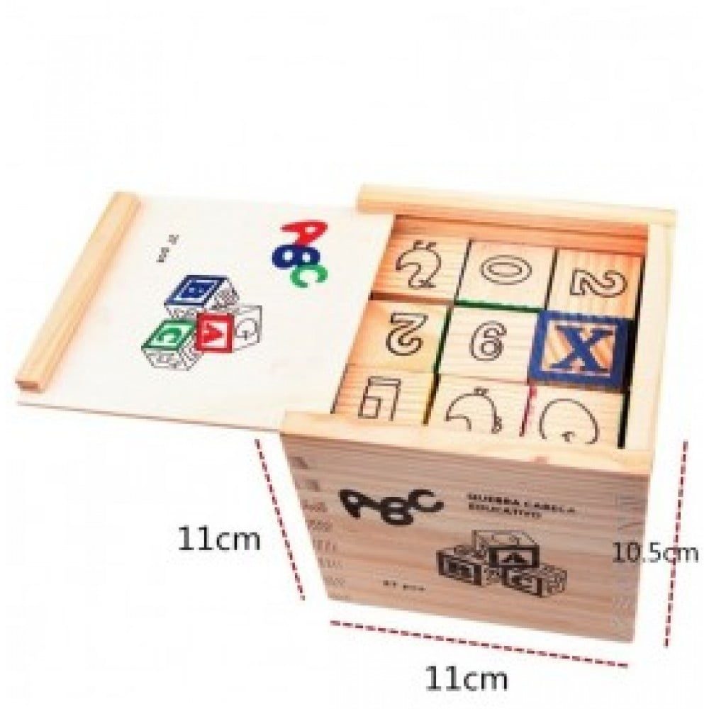 Un set contine cuburi lemn ABC, cu latura de aprox. 3,5 cm, pe fiecare latura a cubului fiind desenate litere, cifre, animale, obiecte.
