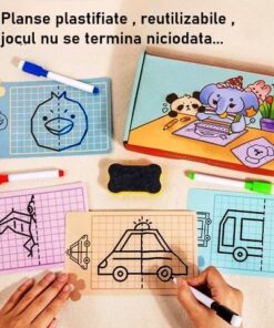- Joc reutilizabil: Desenele pot fi șterse ușor cu buretele inclus, permițând refolosirea planșelor.