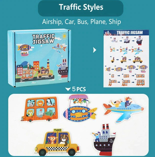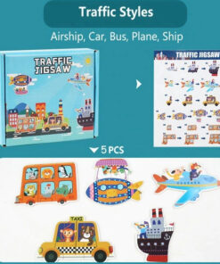 Se pot construi 5 puzzle-uri din 3 piese, 4 si 6 piese cu diverse mijloace de transport: vapor, avion,taxi, balon, autobuz.