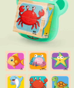Set 6 puzzle cubic din lemn – Animale Marine, 4 cuburi,18 luni+