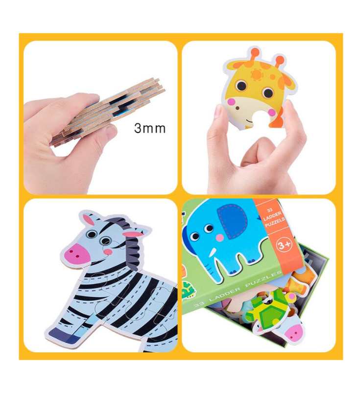 Acest set de puzzle-uri din carton, cu 6 animale simpatice din savana, este perfect pentru dezvoltarea abilităților cognitive și motrice ale celor mici. Fiecare puzzle este colorat viu și reprezintă un animal îndrăgit, precum elefantul, girafa, leul, hipopotamul, zebra și broasca țestoasă. Jocul stimulează creativitatea, concentrarea și coordonarea mână-ochi, fiind ideal pentru copiii de la 3 ani în sus.