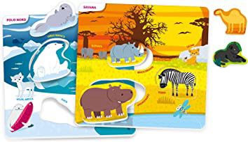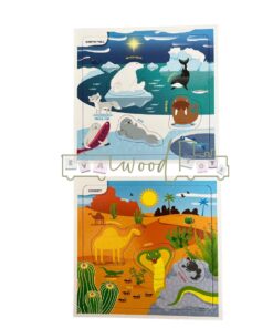- 6 planse cu cate 3 piese detasabile cu denumirea animalelor si locul unde traiesc acestea.