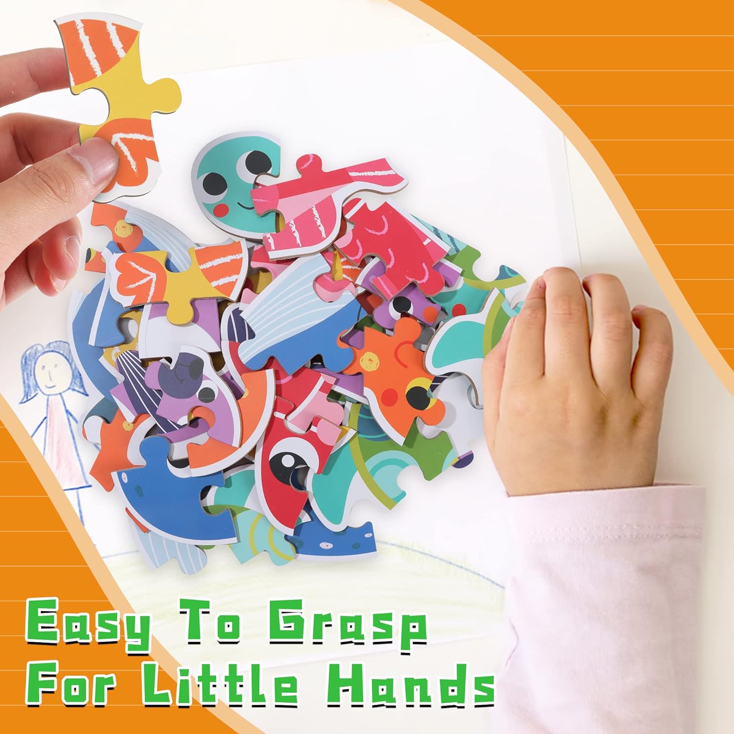 ✅ Design atractiv – Fiecare puzzle ilustrează un animal marin prietenos (balenă, țestoasă, caracatiță, pește, căluț de mare, focă) cu culori vii și detalii atent realizate.