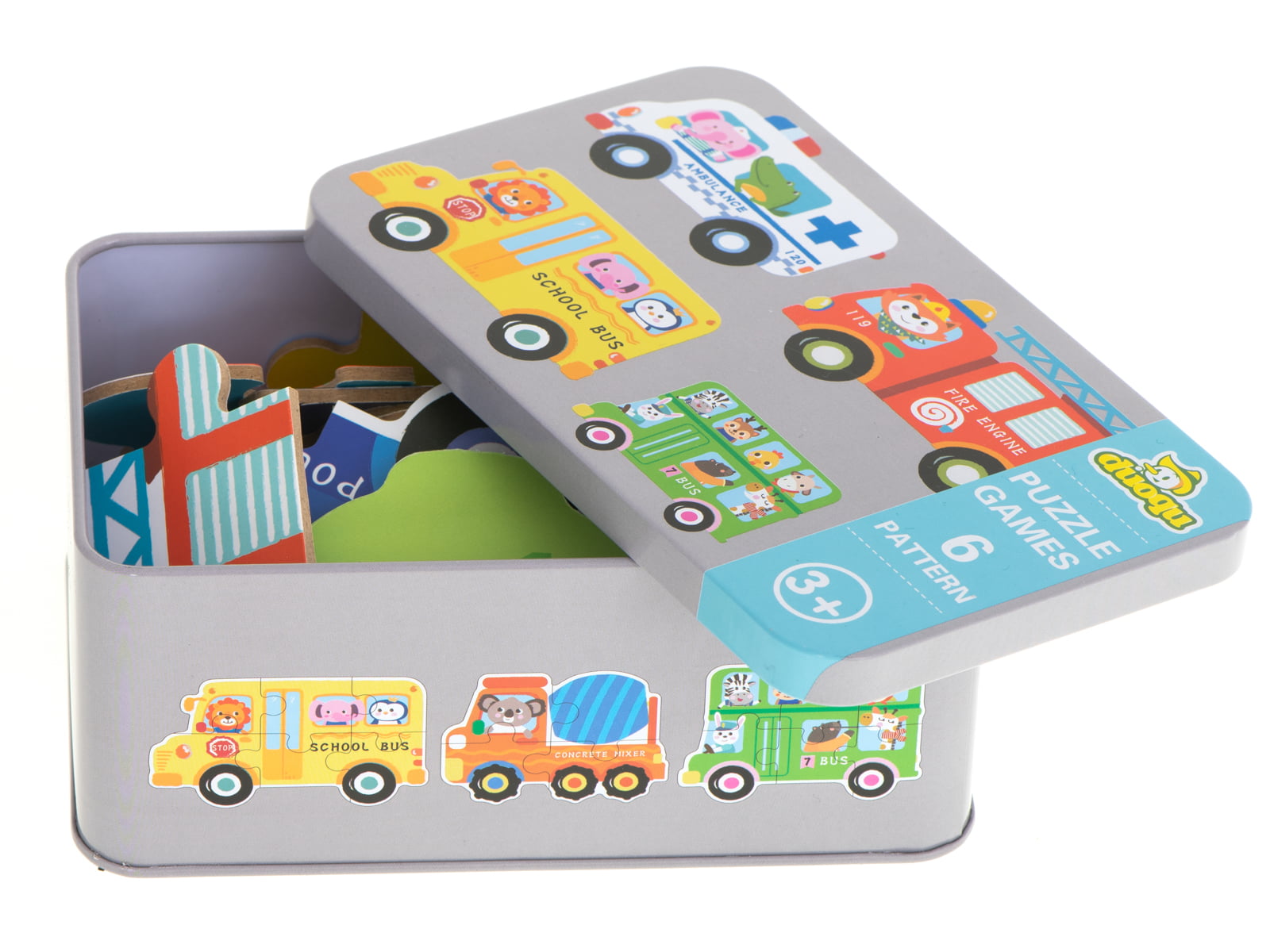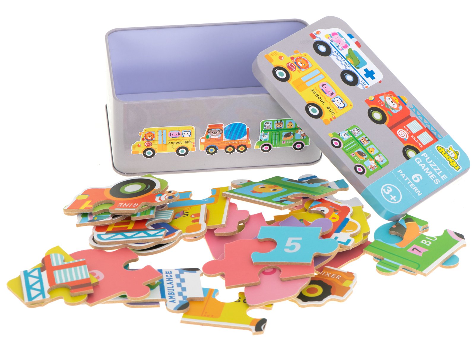 Set 6 puzzle-uri cu animale din Vehicule, in cutie metalica, 30 piese mari