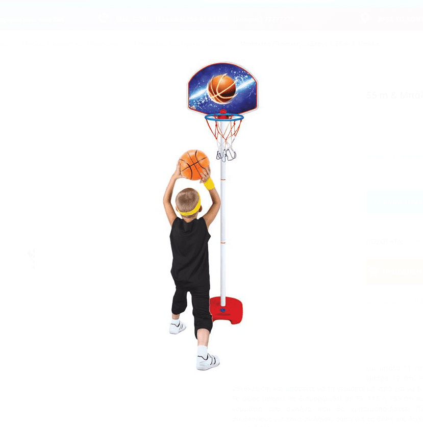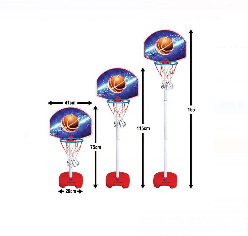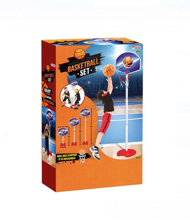 Setul contine un panou din plastic cu suport si o minge cu diametrul de 11 cm. Panoul de baschet are dimensiunea de 41×33 cm, iar cosul are un diametrul de 19 cm. Baza suportului este de 26x6x26 cm și poate fi umpluta cu apă, pentru a o face mai stabilă. Inaltimea poate fi reglata la 75, 115 sau 155 cm in functie de cate piese vor fi folosite in suport.