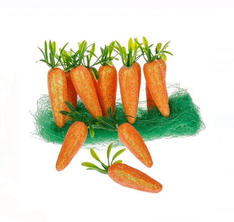 Morcovi decorativi de Paste, din spuma de culoare portocalie cu glitter si tulpina verde. Ambalajul include, iarba verde de sisal pentru a completa decorul.
