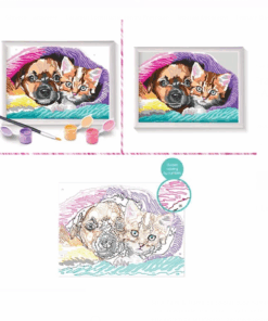 Acest set de pictură pe numere este perfect pentru copiii pasionați de artă și animale, oferindu-le oportunitatea de a colora un tablou expresiv cu un cățeluș și o pisicuță. Fiecare zonă a cartonului preimprimat este numerotată, indicând culoarea corespunzătoare, ceea ce face procesul de pictură ușor și plăcut.