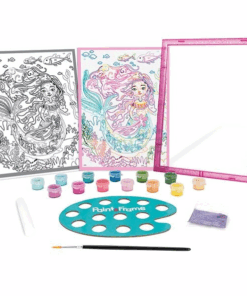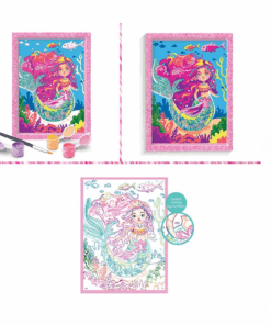 Această activitate creativă este perfectă pentru copiii care adoră poveștile cu sirene și culorile vibrante. Pictura pe numere este o metodă simplă și intuitivă, în care fiecare zonă de pe cartonul preimprimat este numerotată și corespunde unei culori din setul de vopsele acrilice. După ce imaginea este colorată, poate fi decorată cu sclipici biodegradabil pentru un efect strălucitor.