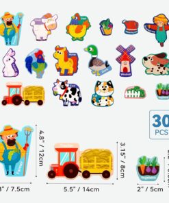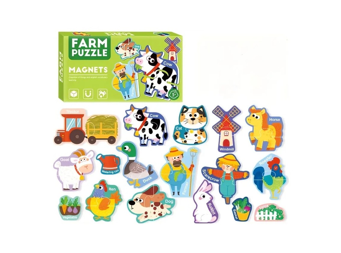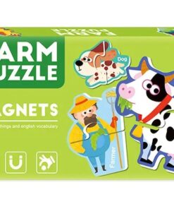 Setul puzzle magnetic Animale de la fermă conține 30 de piese ilustrate viu colorate, perfecte pentru a-i introduce pe cei mici în lumea vieții de la fermă. Copiii descoperă animale îndrăgite precum vaca, calul, câinele, pisica, rața, iepurele sau capra, dar și elemente specifice precum fermierul, tractorul, sperietoarea de ciori și legumele proaspete. Piesele sunt magnetice, ușor de atașat pe frigider, tablă magnetică sau alte suprafețe metalice, fiind rezistente și sigure pentru mâinile celor mici.