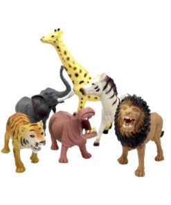 Setul contine 6 animale salbatice mari, din cauciuc, precum: girafa, zebra, hipopotam, leu, tigru si elefant.