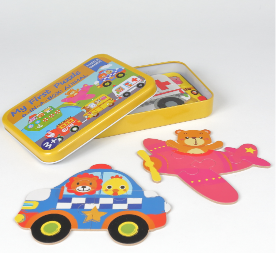 Setul de puzzle-uri vine ambalat intr-o cutie metalica, fiind astfel usor de strans, depozitat si transportat la cresa, la gradinita. Totodata este si un bun companion pentru concediu.