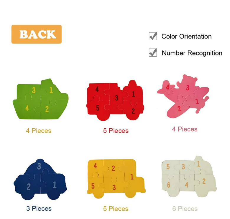 Acest set cu 6 puzzle-uri din lemn, este ideal pentru a-i introduce pe cei mici in lumea puzzle-urilor Fiind alcatuite din cate 3 piese,4, 5, 6 piese sunt perfecte si usor de asociat. Datorita dimensiunilor mari ale pieselor, copilasii pot prinde piesele cu usurinta, iar datorita culorilor vii, acestia vor fi captivati si vor dori sa descopere rapid rezolvarea jocului.