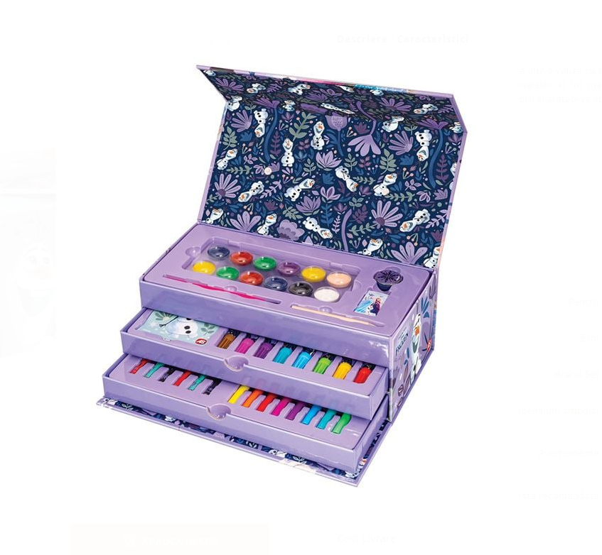 Setul este organizat într-o valiză elegantă cu design tematic Frozen 2, având două sertare pentru o mai bună organizare și un mâner practic, ideal pentru a fi transportat cu ușurință.