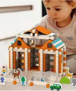 Acest set de construcție din lemn conține 107 piese de construcție și 15 minifigurine din lemn, fiind conceput pentru a stimula imaginația și îndemânarea copiilor de la 3 ani în sus. Cu ajutorul pieselor colorate și robuste, cei mici pot crea diverse structuri precum case, ferme, vehicule și alte construcții ingenioase.
