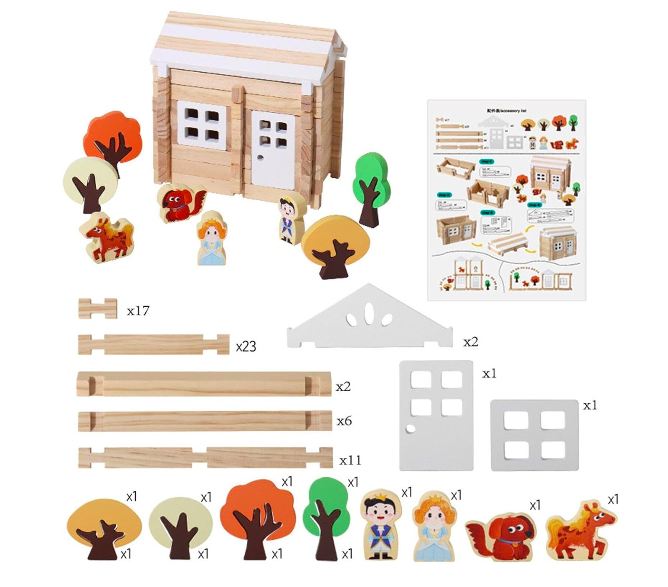 - 170 piese variate (bucăți de lemn pentru îmbinare, acoperișuri, uși, geamuri, accesorii decorative).