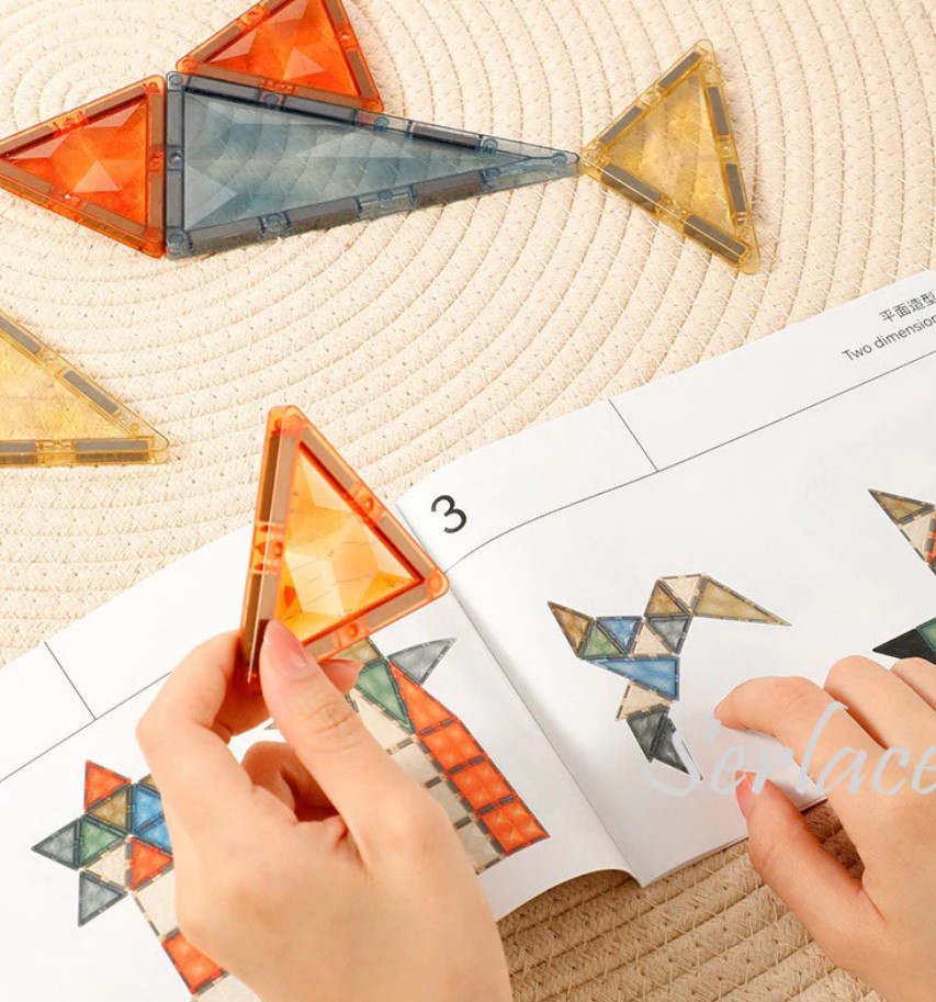 Copiii pot alege piesele dorite și le pot atașa între ele datorită magneților încorporați. Se pot construi forme simple (pătrate, cuburi, piramide) sau structuri complexe (rachete, castele, animale, stele). Piesele translucide permit și jocuri de lumină, fiind ideale pentru explorări creative.