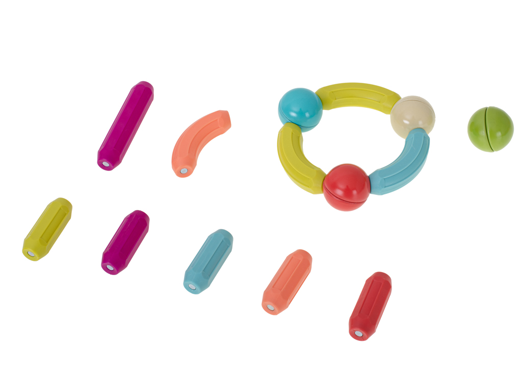 - contine diferite forme, care se imbina prin principiul magnetismului, copilul poate crea diferite forme, si combinatii dupa propria imaginatie