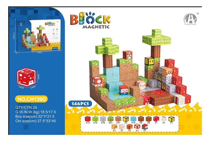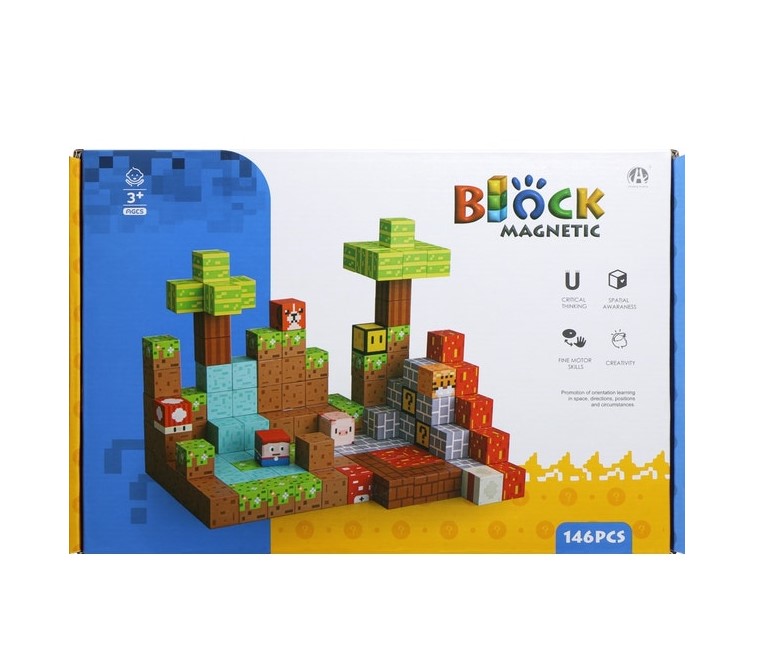 Setul de construcție magnetic inspirat din universul Minecraft este o jucărie creativă și educativă care le permite copiilor să construiască, să experimenteze și să exploreze lumea blocurilor într-un mod real și interactiv. Cu 146 de piese magnetice viu colorate, cei mici pot recrea scene din joc sau își pot imagina propriile lumi, dezvoltând astfel creativitatea, răbdarea și coordonarea mână–ochi.