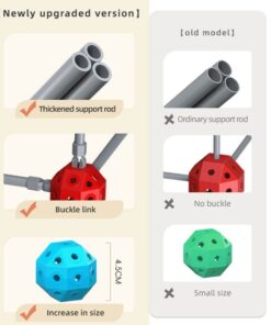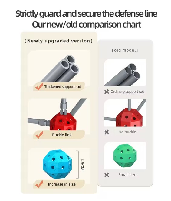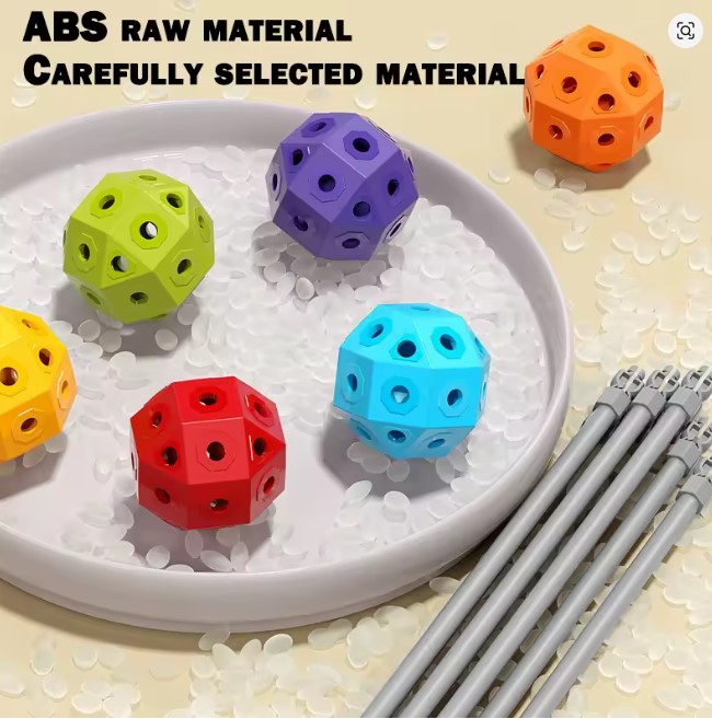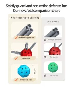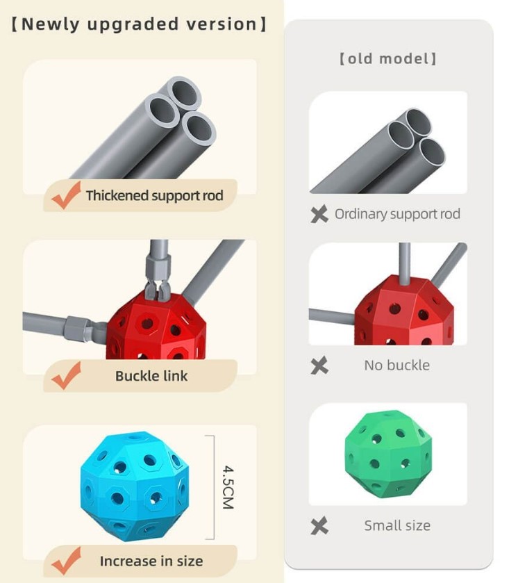 Design îmbunătățit: tije groase pentru stabilitate, sistem de prindere cu clic pentru conexiuni ferme, sfere mai mari (4,5 cm diametru) pentru o manevrare ușoară.