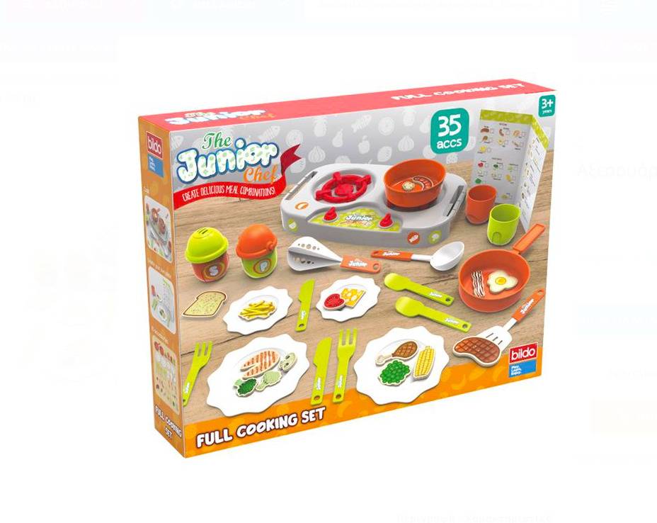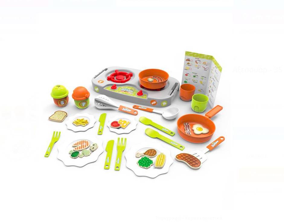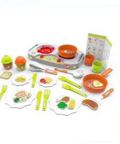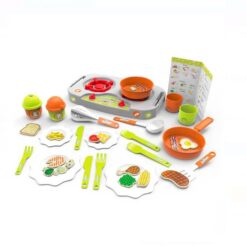 Set cu plită dublă mică, ustensile, articole de servire și alimente și mâncăruri realiste. Creează mâncăruri uimitoare pentru tine și prietenii tăi ca un adevărat bucătar.