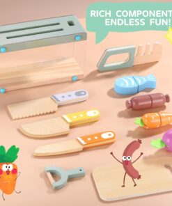Copilul poate „felia” legumele și alimentele prinse cu arici (sistem tip velcro), poate aranja alimentele pe tocător, le poate tăia, sorta sau „prepara” meniuri. Suportul pentru cuțite și varietatea ustensilelor oferă o experiență de joacă realistă și captivantă. Ideal pentru jocul individual sau în echipă, în familie sau la grădiniță.