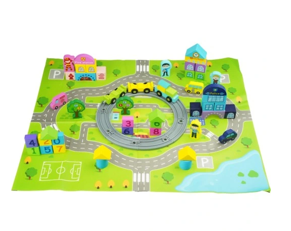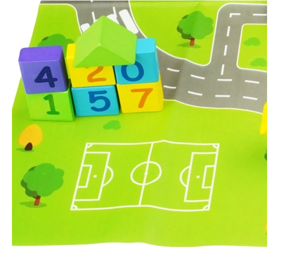 Acest set educativ de constructie cu covoras in culori vibrante. Sunt continute toate elementele necesare pentru construirea unui orasel in miniatura.
