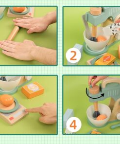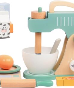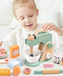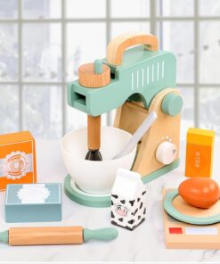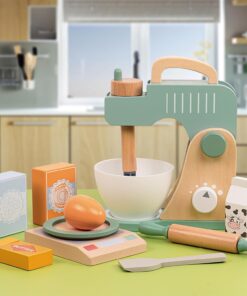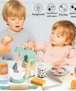 Acest set de mixer din lemn este o jucărie de rol care imită un mixer real, oferind o experiență autentică și educativă. Copiii vor putea experimenta procesul de preparare a prăjiturilor, dezvoltând imaginația, abilitățile motrice fine și coordonarea mână-ochi.