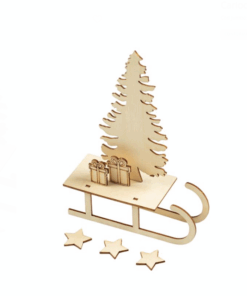 Setul creativ, pentru lucru manual acasa sau la gradinita contine ornamente de lemn si cadouri pentru a le pune pe sanie.