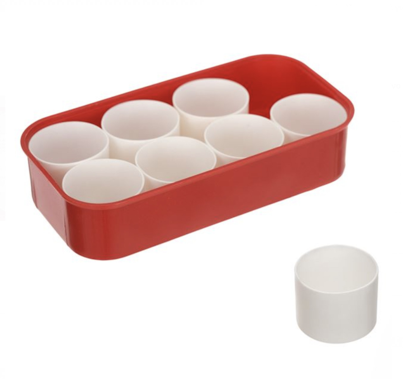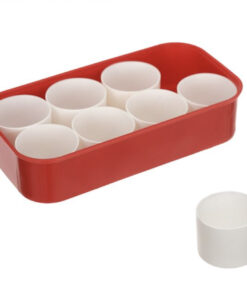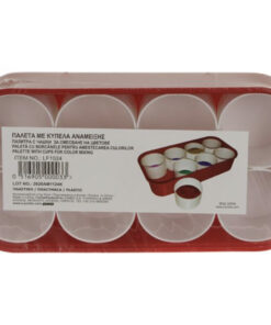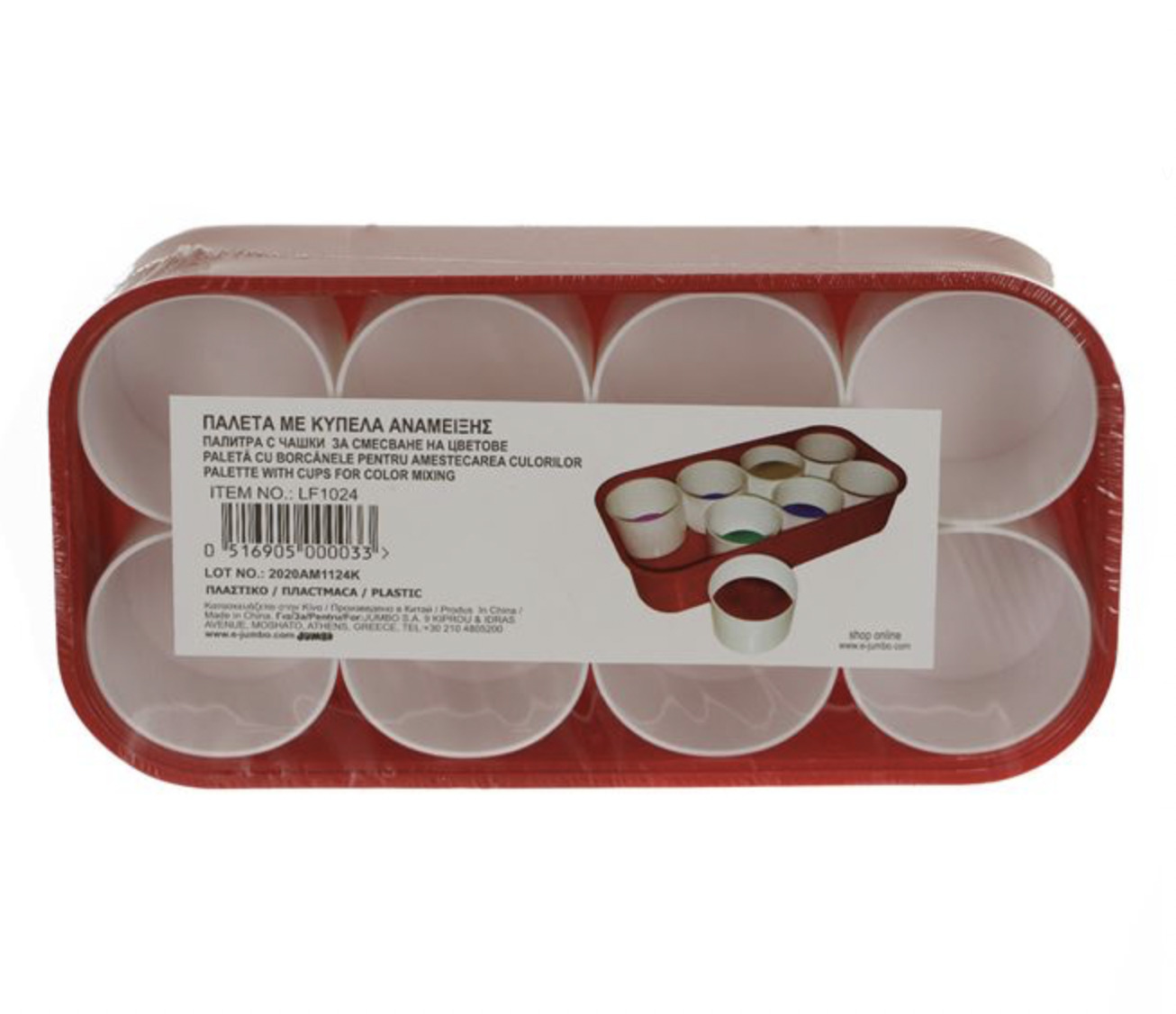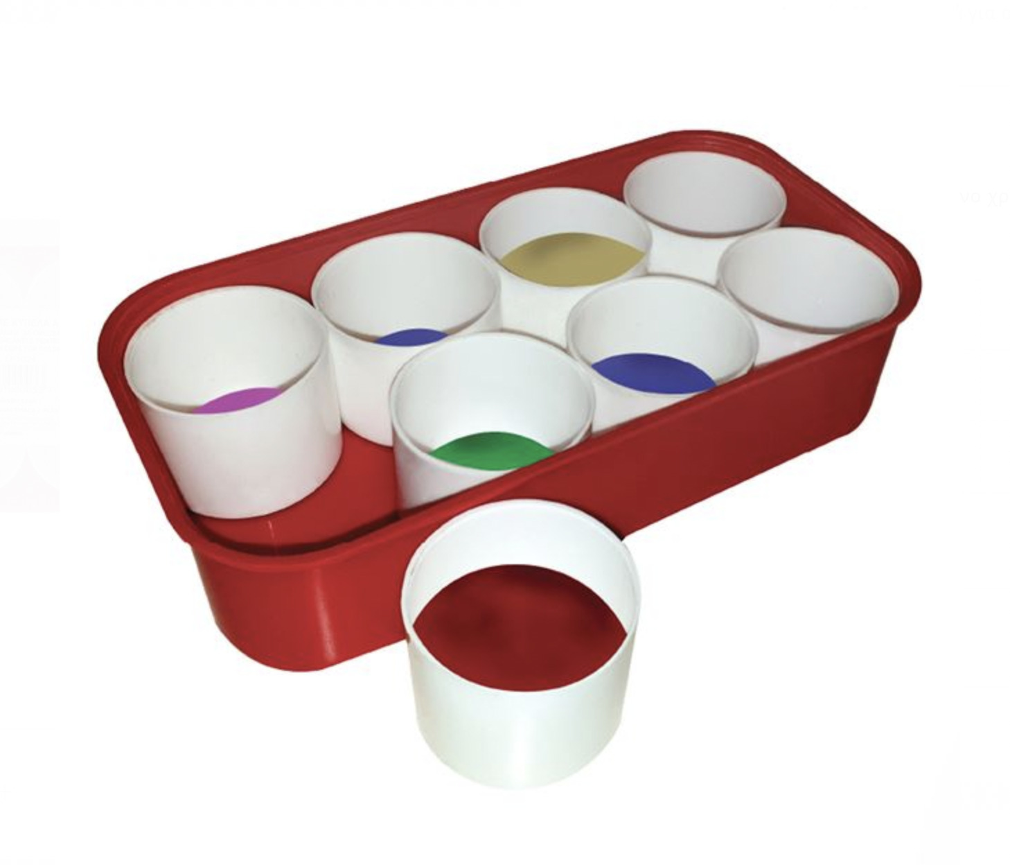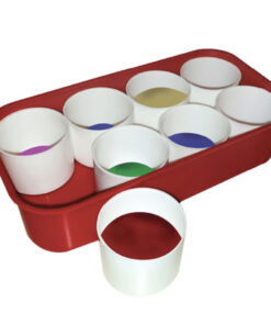 Setul contine o tavita din plastic, de culoare rosie, in interiorul careia se regasesc 8 pahare de plastic, pentru depozitarea culorilor folosite in timpul activitatii de pictura.