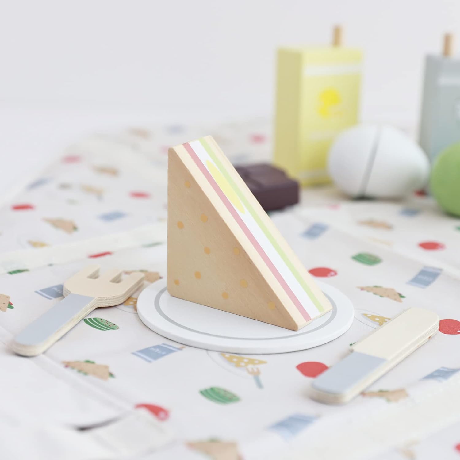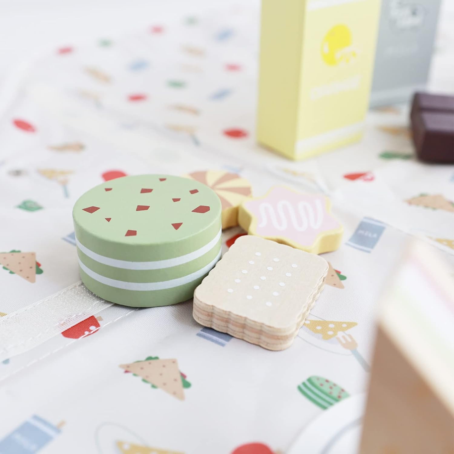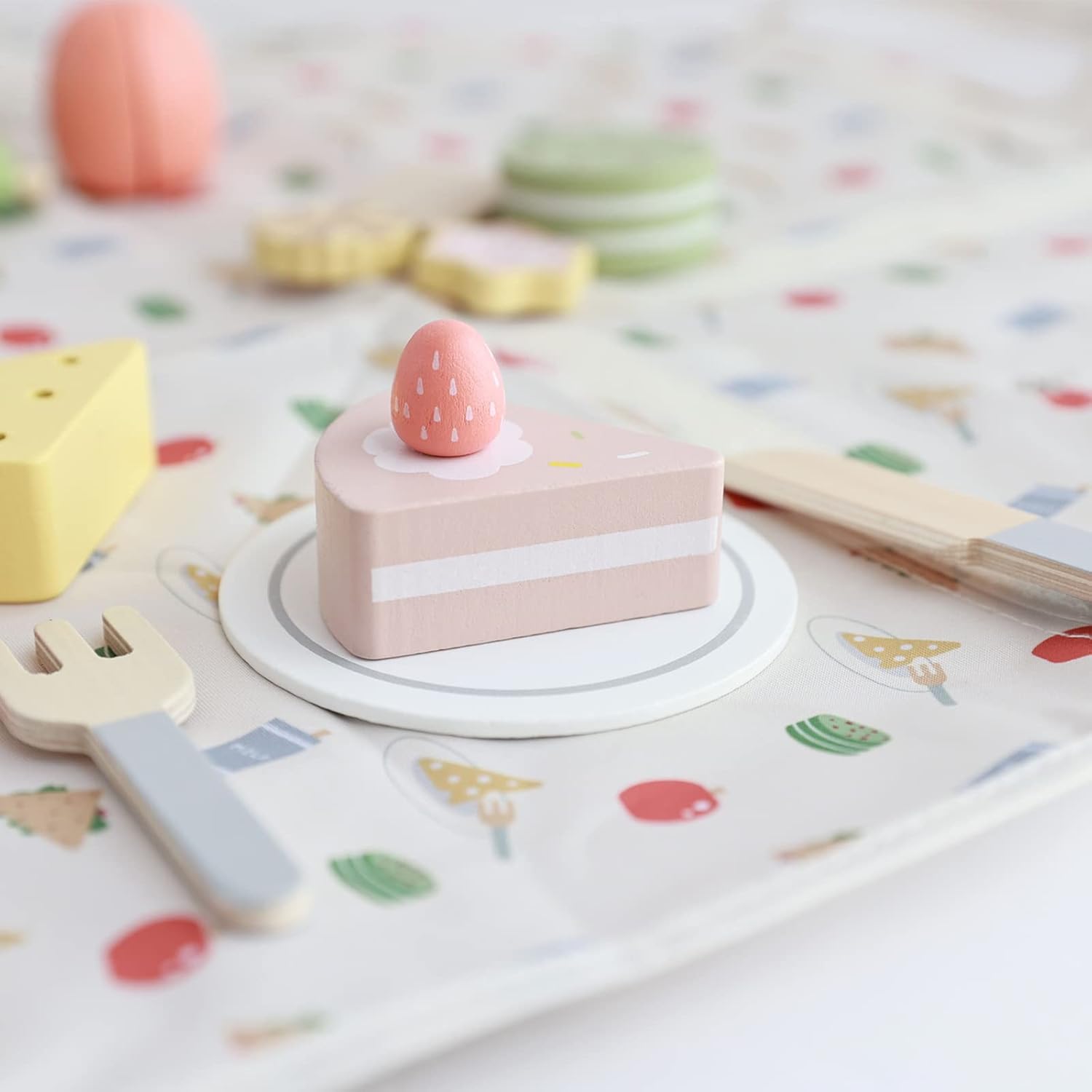 - Număr de piese: 24 accesorii, inclusiv tacâmuri, farfurii, alimente din lemn, cești și suport pentru picnic.