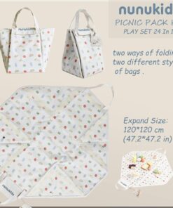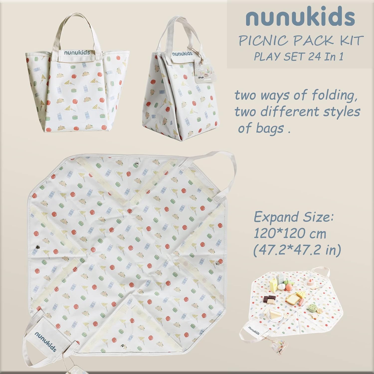 Setul include tacâmuri, farfurii, cești, alimente din lemn și o pătură specială de picnic, care se transformă în geantă pentru transport.