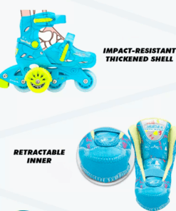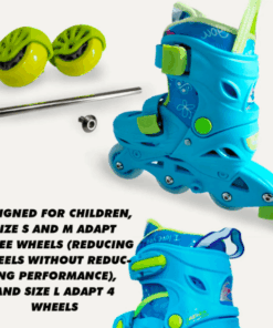 Design 2 în 1 – role cu 3 roți în linie + 2 roți laterale pentru începători (mod T); roțile ajutătoare se pot îndepărta ușor pentru trecerea la nivel avansat (3 roți în linie)