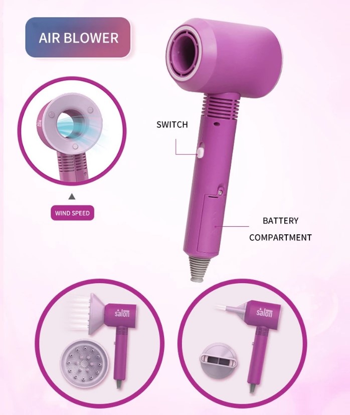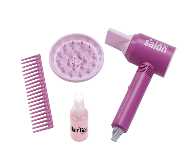 Uscătorul de păr funcționează pe baterii și dispune de două trepte de viteză, oferind un efect realist de aer suflat, exclusiv rece, fără rezistență termică. Accesoriile incluse – difuzor, duză, pieptene și sticluță decorativă tip „gel de păr” – completează experiența și permit recrearea unui ritual autentic de styling pentru păpuși sau în cadrul jocurilor imaginative.