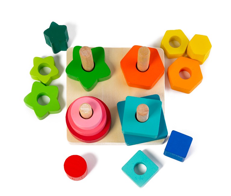 Jucaria educativa, din lemn, pentru sortarea, stivuire si potrivirea formelor geometrice ajuta copilul sa invete formele geometrice, il invata sa numere, il invata culorile, il invata sa sorteze.