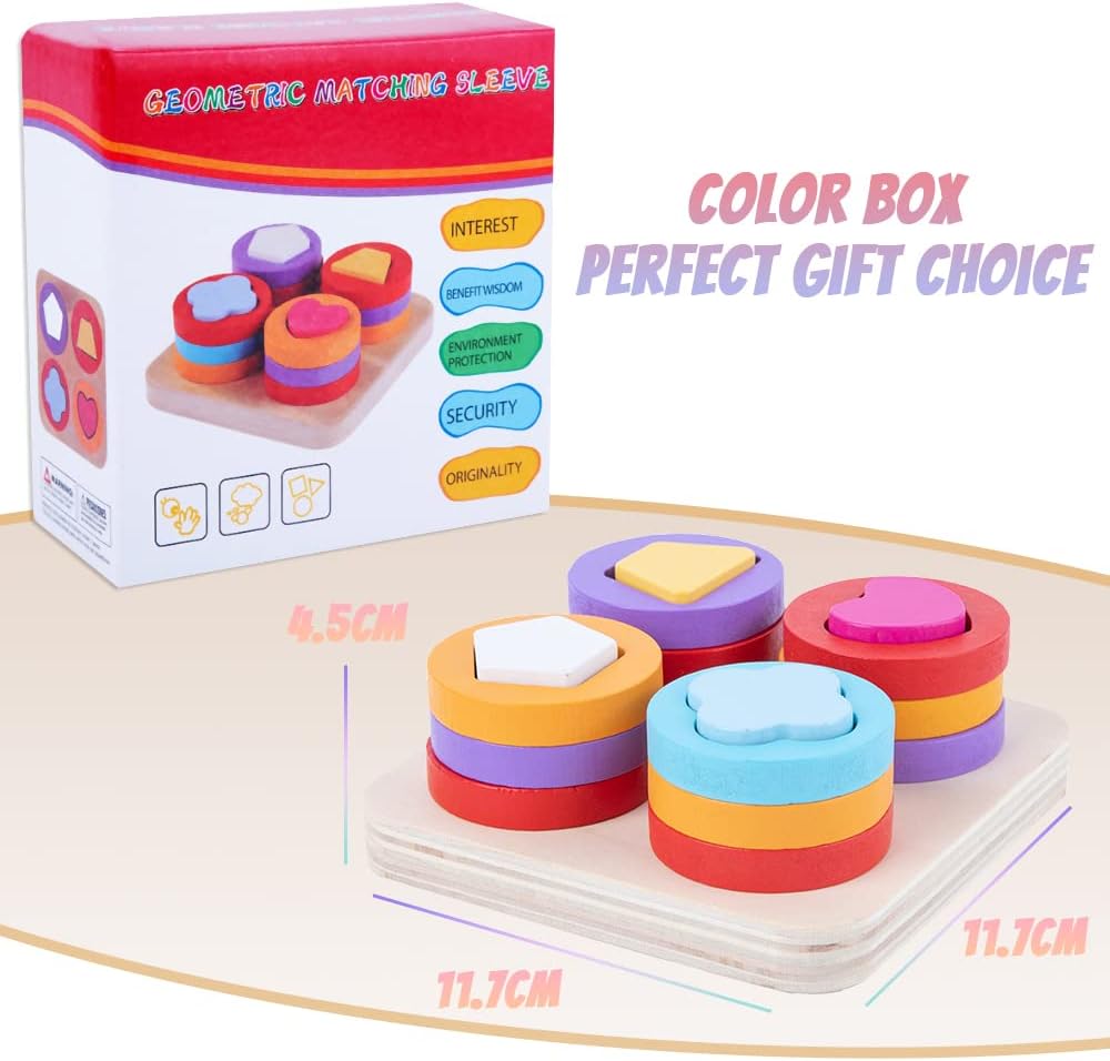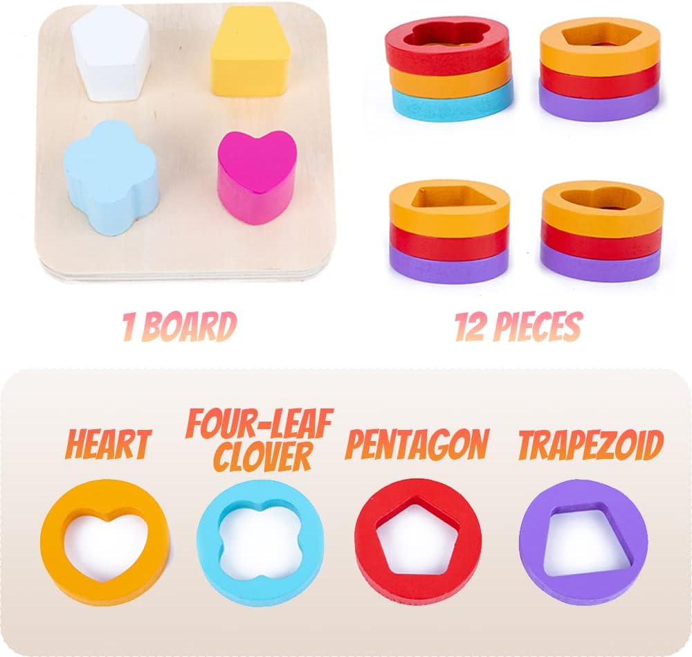 Un sortator educativ din lemn, conceput pentru a ajuta copiii să învețe formele geometrice și să exerseze coordonarea mână-ochi prin joc. Setul include o placă de bază cu 4 coloane și 12 piese colorate în forme variate (inimă, trifoi cu patru foi, pentagon și trapez).