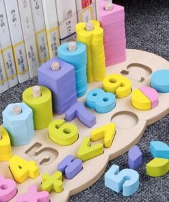 Coloane logaritmice cu forme geometrice, unde copilul stivuiește pe fiecare coloană numărul corespunzător de forme în funcție de cifră