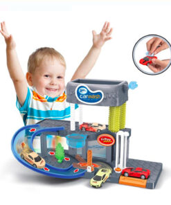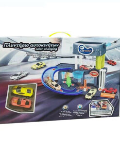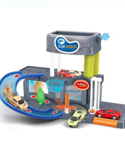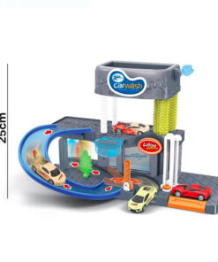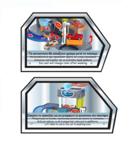 Spălătorie auto cu 2 nivele, lumini și sunete. Mașinile își schimbă culoarea după spălare. Așezați mașina pe lift pentru a o duce la al doilea nivel unde se află periile și apa. Functioneaza cu 2 baterii AA (nu sunt incluse).