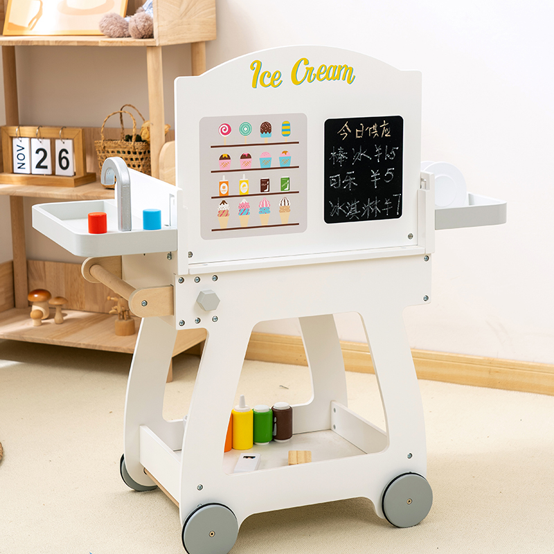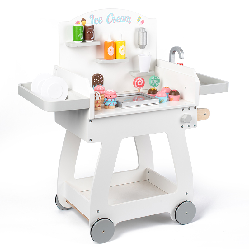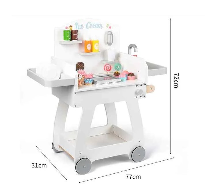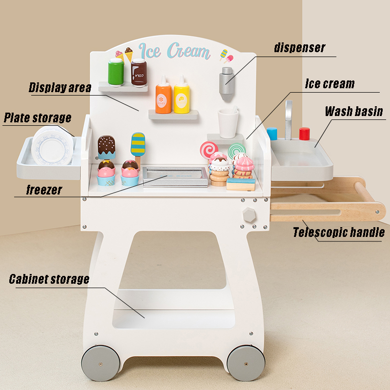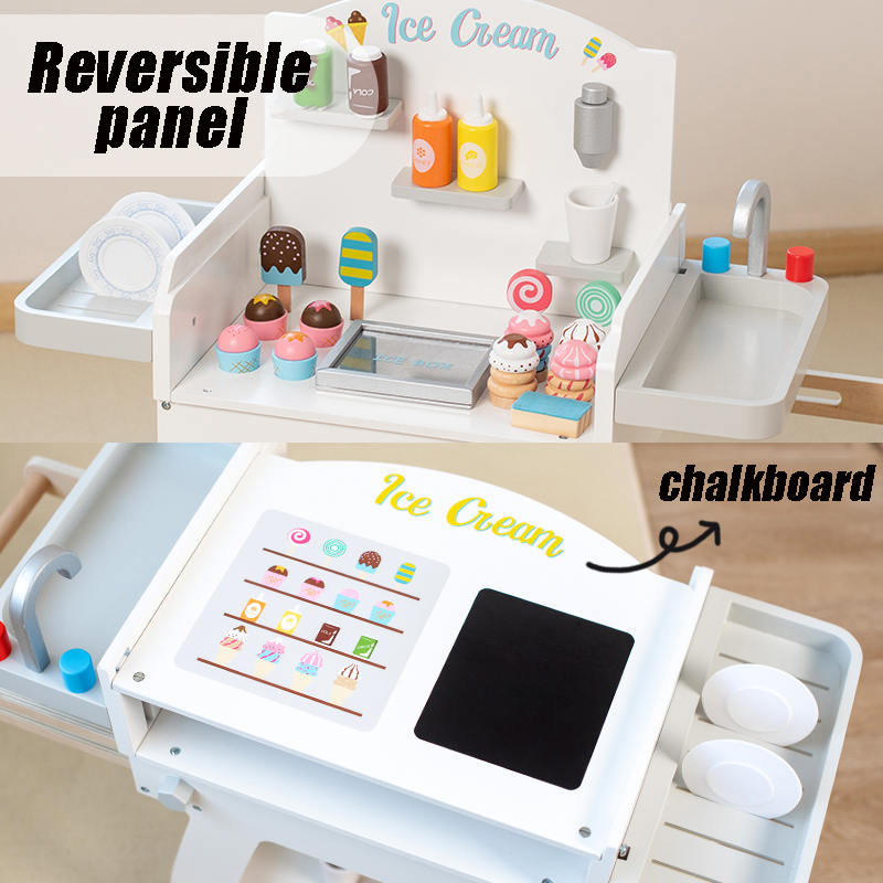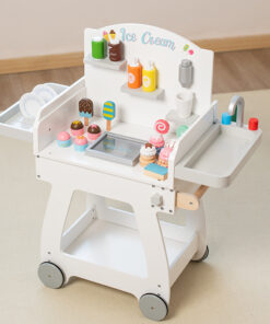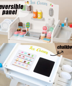 Structura solidă din lemn, compartimentarea inteligentă și multitudinea de accesorii (înghețate, topping-uri, băuturi, farfurii) oferă multiple scenarii de joc, stimulând creativitatea și gândirea logică. Panoul reversibil cu tablă de scris permite personalizarea meniului, dezvoltând exprimarea și imaginația.
