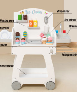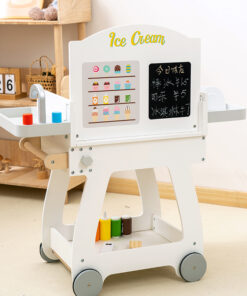 Standul de înghețată din lemn este o jucărie educativă complexă, concepută pentru a susține jocul de rol și dezvoltarea abilităților sociale ale copiilor. Inspirat din activitățile reale, acest stand transformă joaca într-o experiență autentică de „magazin de înghețată”, unde copilul devine vânzător, client sau organizator.