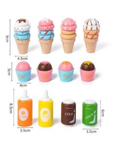 Copilul poate organiza propriul „stand de înghețată”, aranjând produsele pe rafturi și creând un meniu personalizat pe tablă. Prin joc liber sau ghidat, poate simula situații reale: servirea clienților, alegerea produselor, combinarea aromelor sau gestionarea unui mic „business”.