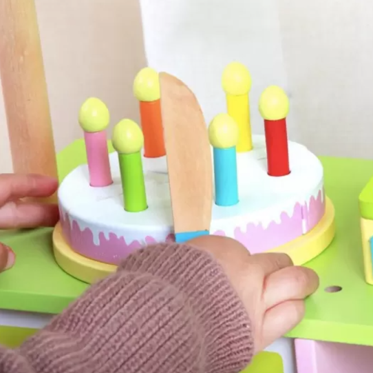 - Accesorii incluse: Un tort aniversar din lemn cu lumânări detașabile, prăjituri, cuțit și spatulă de servit, precum și o casă de marcat cu card bancar pentru a completa experiența.