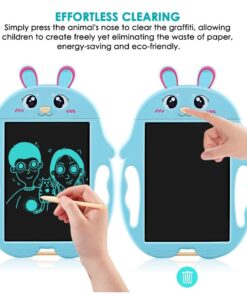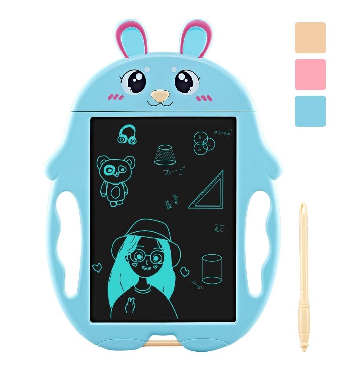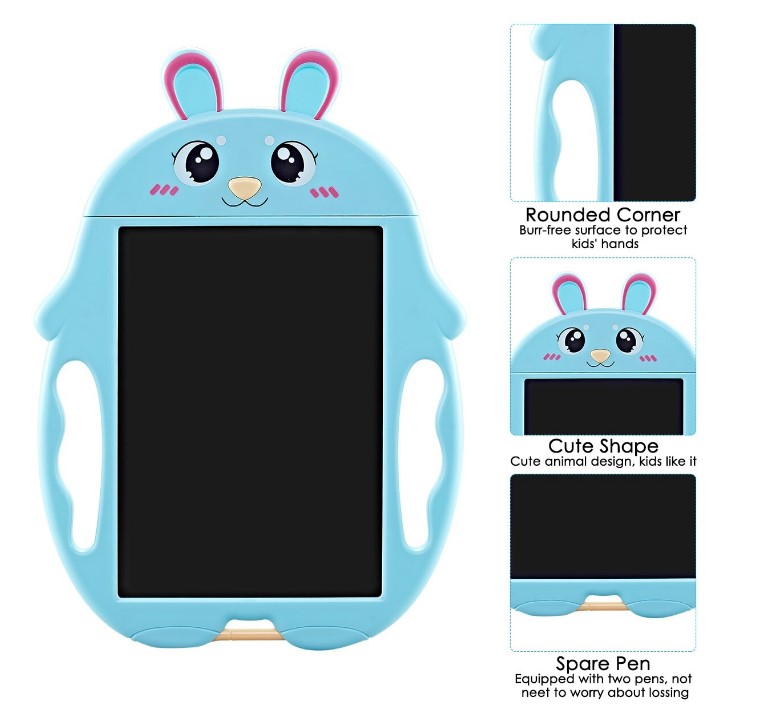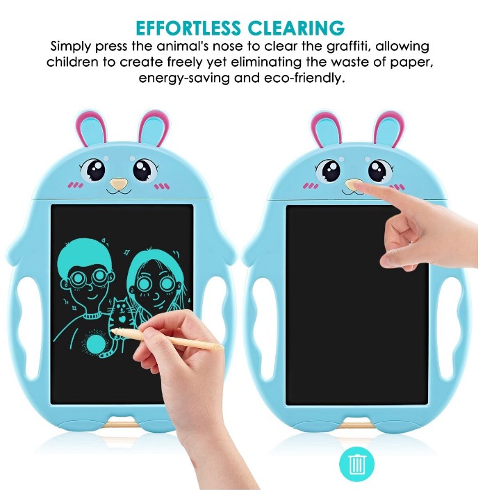 Tableta grafică LCD în formă de iepuraș albastru este o jucărie educativă și practică pentru copii, perfectă pentru scris, desenat sau exersarea calculelor simple, într-un mod distractiv și eco-friendly. Ecranul LCD de 9 inch (aprox. 23 cm) permite desenarea și ștergerea rapidă, fără a folosi hârtie sau creioane.