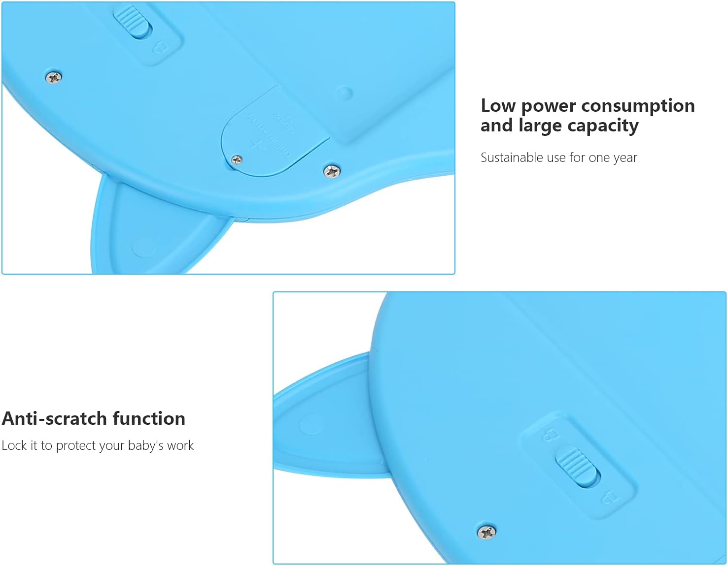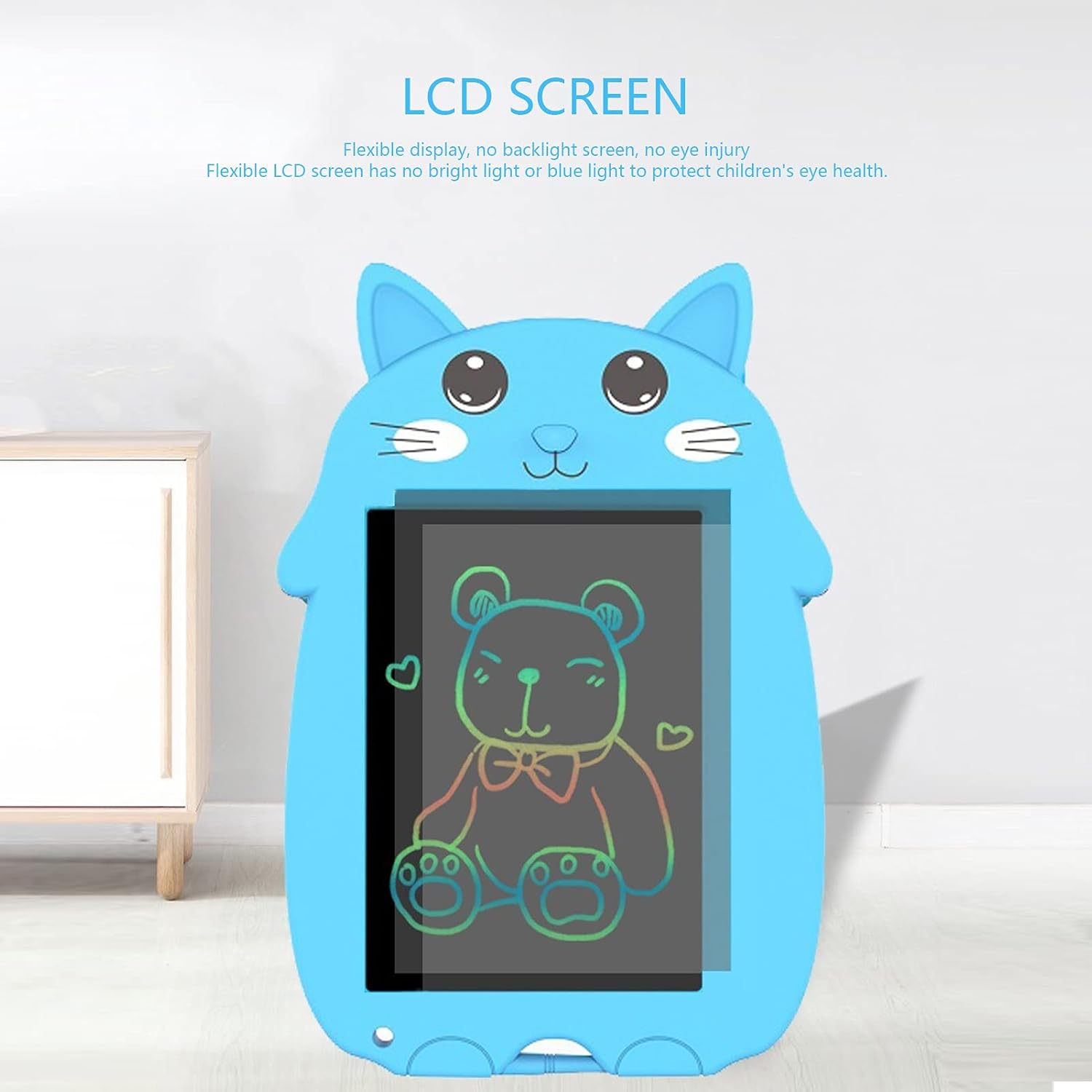 Această tabletă grafică LCD, cu un design adorabil de pisicuță pe nuata de albastru, este un instrument educativ și distractiv pentru copii, dar și un gadget practic pentru părinți. Permite scrierea, desenul și notițele rapide, fără a folosi hârtie sau creioane, contribuind astfel la protejarea mediului.