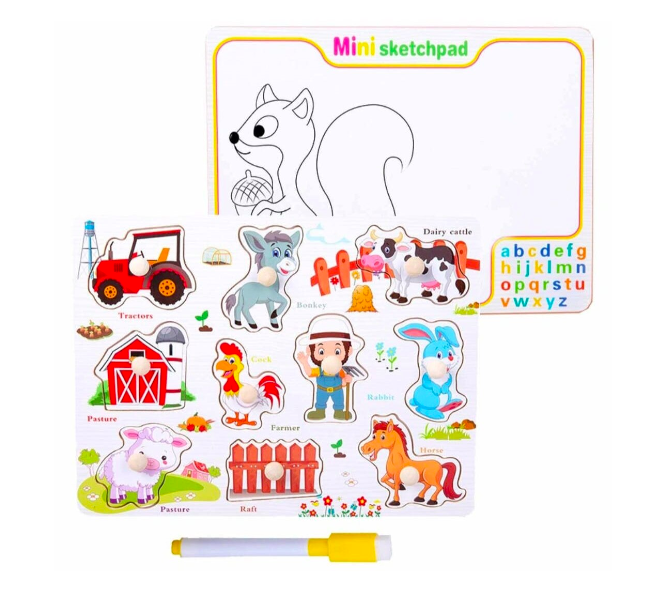 - Puzzle incastru din lemn: Include personaje și elemente de fermă precum fermierul, vaca, măgarul, cocoșul, calul, iepurele și multe altele. Fiecare piesă este prevăzută cu un mâner ușor de prins, perfect pentru copiii mici.