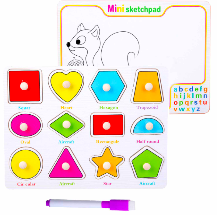 - Puzzle incastru din lemn: Include forme geometrice de bază, precum cercul, pătratul, triunghiul, steaua, inima și altele. Fiecare piesă are un mâner ergonomic, fiind ușor de prins de către copii.