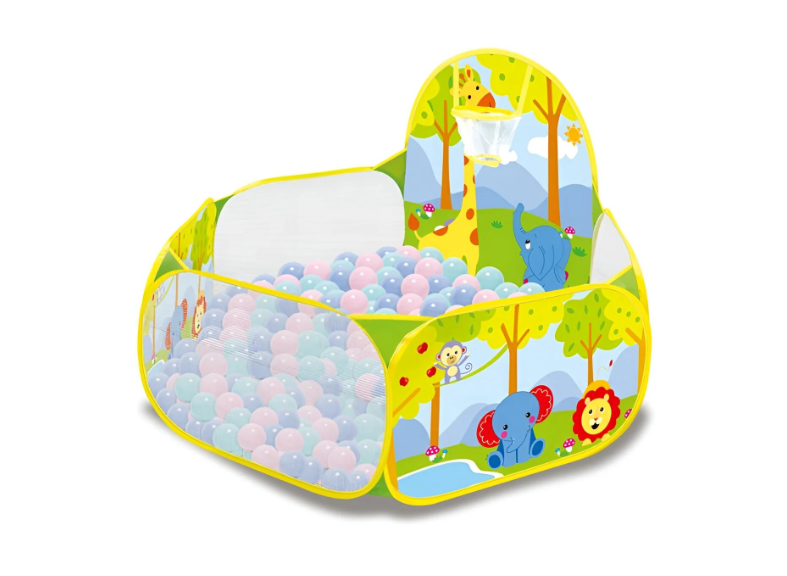 Structura este stabilă, cu pereți din plasă transparentă care permit supravegherea constantă a copilului. Baza este suficient de generoasă pentru mișcare liberă, iar cele 100 de bile colorate transformă tarcul într-o adevărată mini-piscină cu bile.
