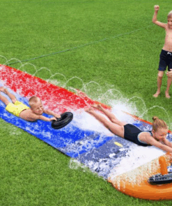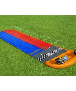Toboganul de apa este confectionat din PVC, cu pista dubla si are o lungime de 4.88 metri. Este usor de montat, doar conectati furtunul de gradina si distractia poate incepe.