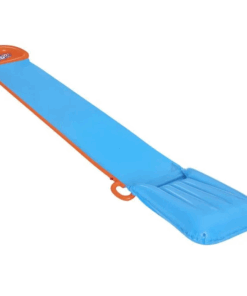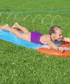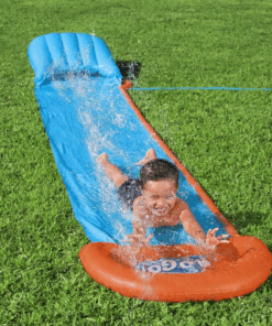 Toboganul de apa este confectionat din PVC, cu pista dubla si are o lungime de 4.72 metri. Este usor de montat, doar conectati furtunul de gradina si distractia poate incepe.