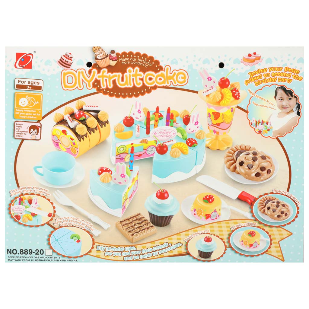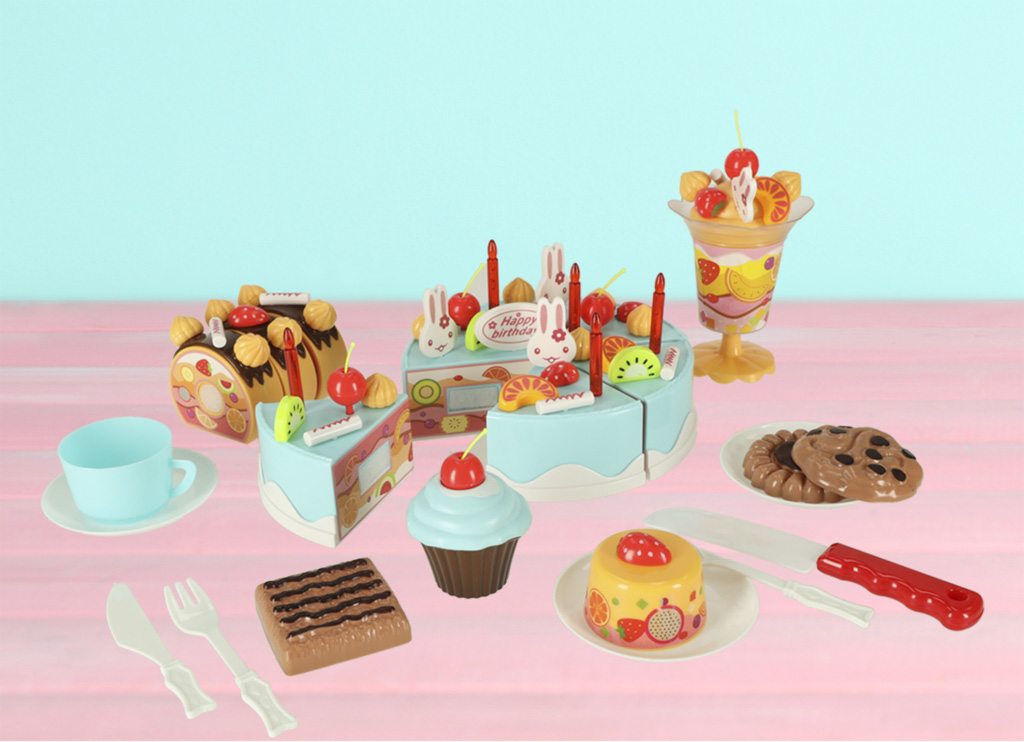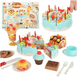 Tortul de ziua copiilor poate fi decorat în mod liber! Pe langa un tort de aniversare colorat cu accesorii decorative pentru divertisment (in total 37 de articole) în set, există și o rulada colorată cu piese suplimentare care pot fi conectate prin banda cu arici și accesorii decorative (până la 12 elemente suplimentare) , precum și o cupcake, prăjituri, farfurii, o ceașcă, jeleu, tacâmuri (14 articole suplimentare) și înghețată într-o ceașcă (alte 12 articole).