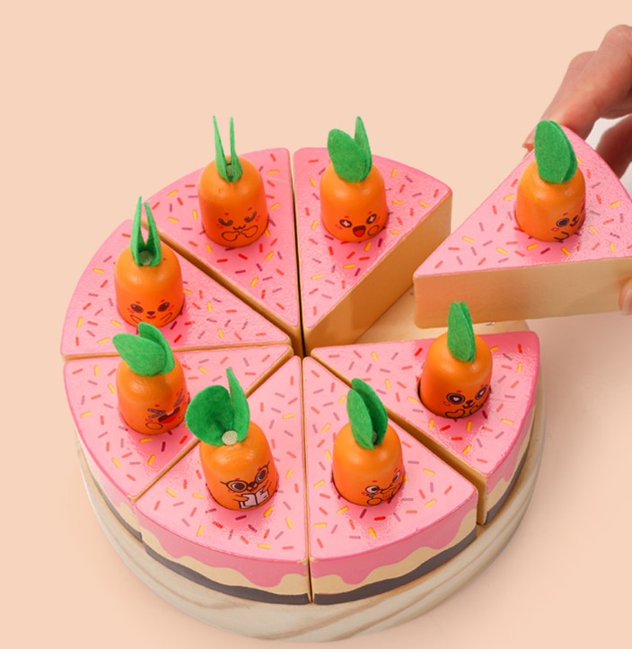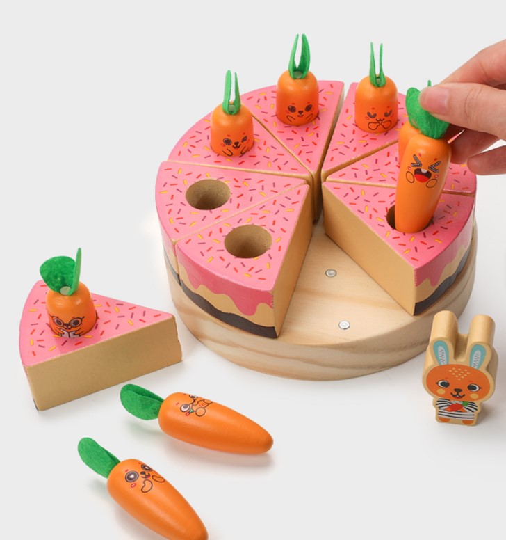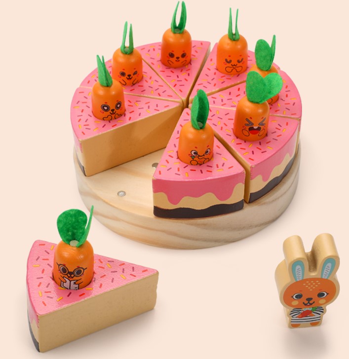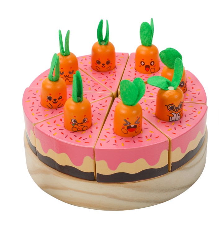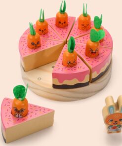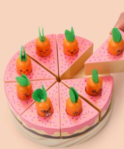 Acest tort colorat din lemn este o jucărie educativă și distractivă, ideală pentru copiii de la 3 ani. Realizat din lemn natural, cu margini rotunjite și vopsele non-toxice, tortul este alcătuit din 8 felii detașabile și morcovi simpatici care pot fi scoși și așezați la loc în găurile special decupate.
